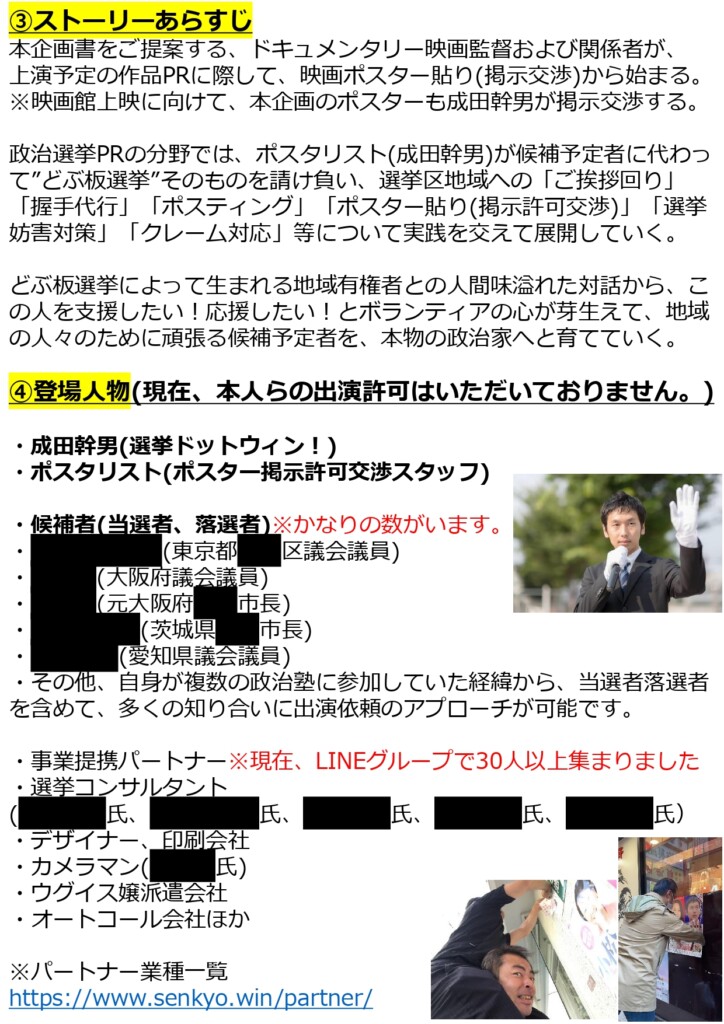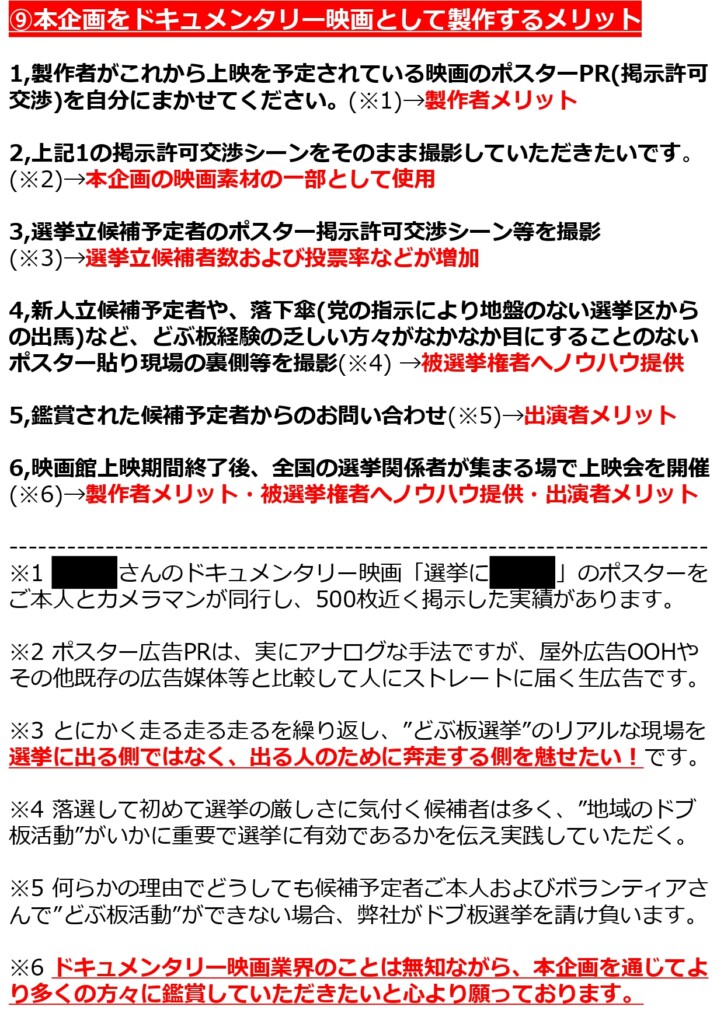 ※1 ●●●さんのドキュメンタリー映画「選挙に●●●」のポスターをご本人とカメラマンが同行し、500枚近く掲示した実績があります。
